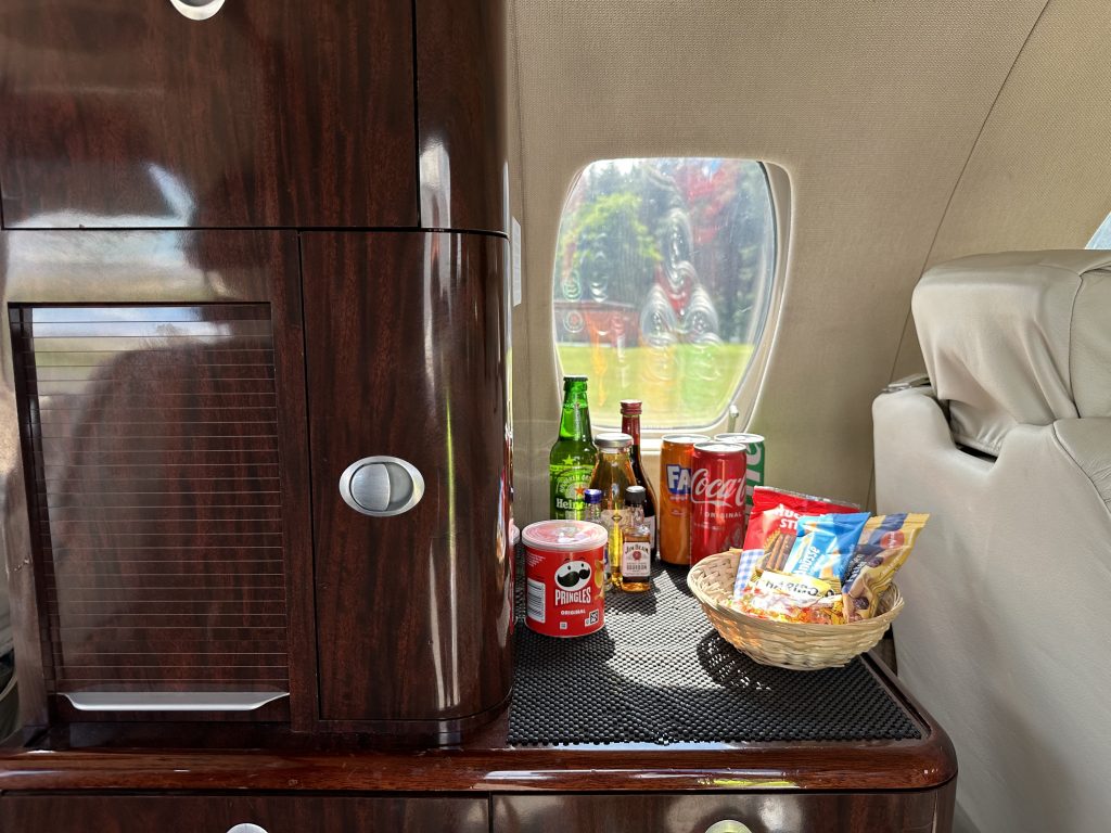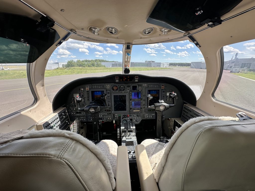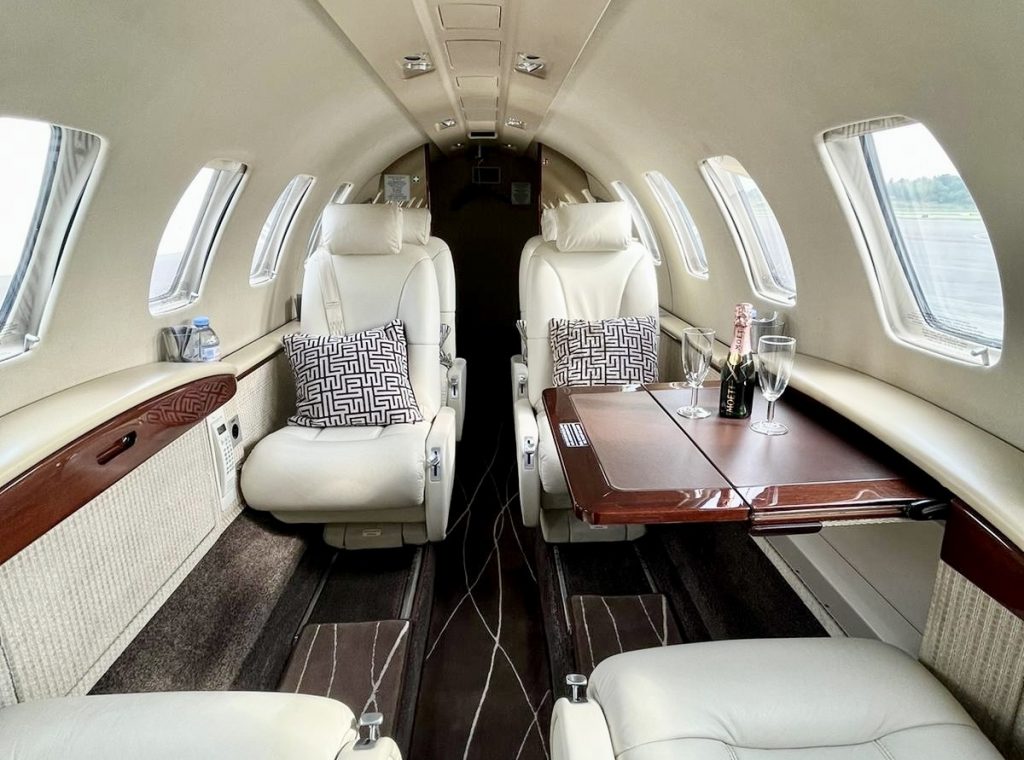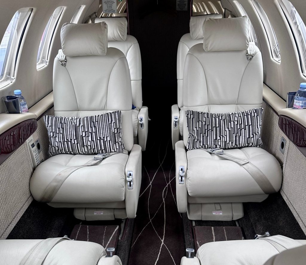 Klassisch edles Kabineninterieur kombiniert mit einer angenehmen Kabinenbreite lassen keine Wünsche im Light-Jet Sektor offen. Das Ganze wird durch komfortable Clubsessel aus weichem Leder unterstreichen, die sich seitwärts in den Gang und in angenehme Liegepositionen verstellen lassen. Die extrem hohe Reisehöhe und Geschwindigkeit ermöglicht es Ihnen Ziele außerhalb Europas zu erreichen. Die gut ausgestattete Bordküche lädt zu gutem Wein, Whiskey oder heißem Kaffee ein. Kleine Snacks sind inklusive.